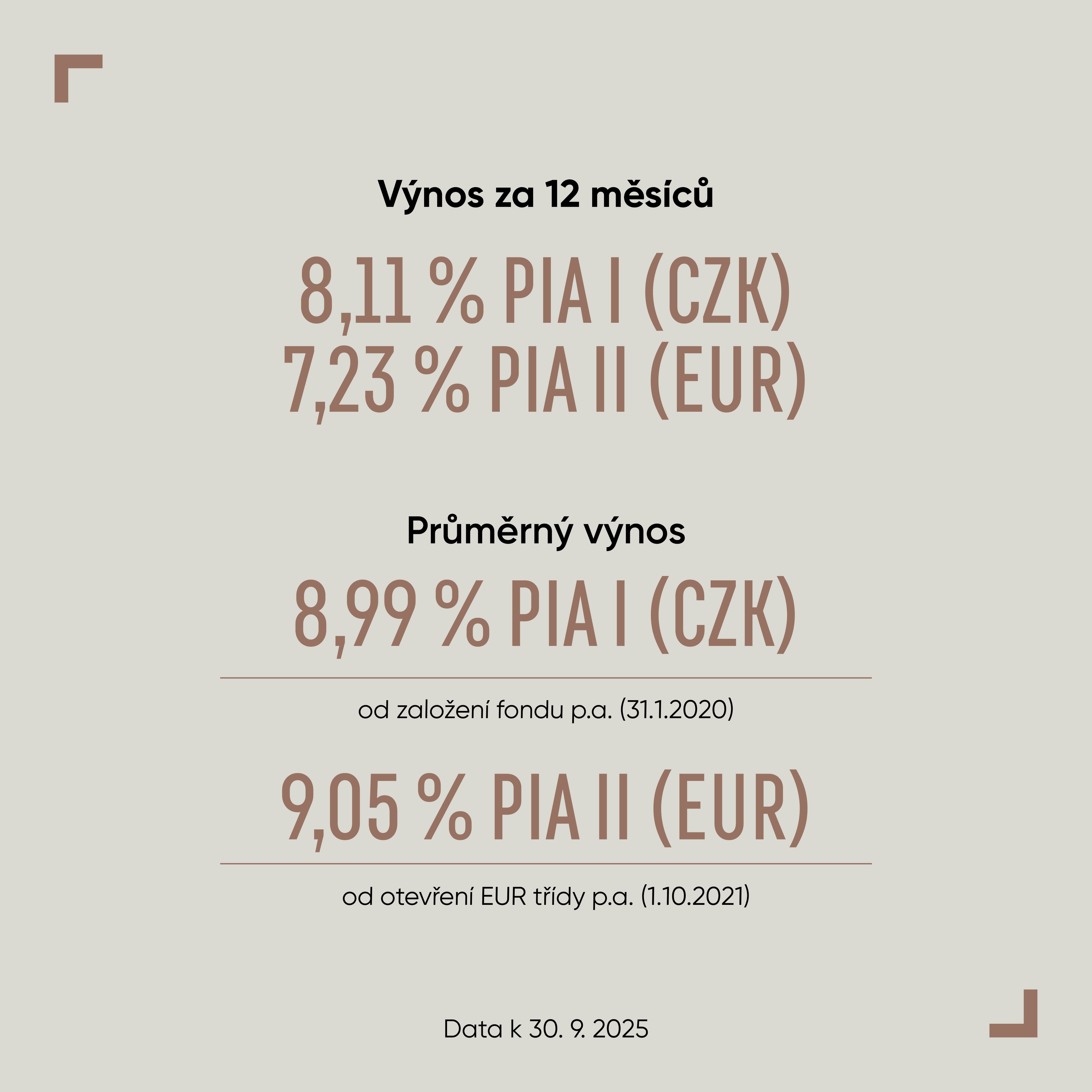 Výnos za posledních 12 měsíců činil 8,11 % u PIA I (CZK) a 7,23 % u PIA II (EUR). Průměrný výnos od založení fondu je 8,99 % p.a. (PIA I), respektive 9,05 % p.a. od otevření EUR třídy (PIA II).